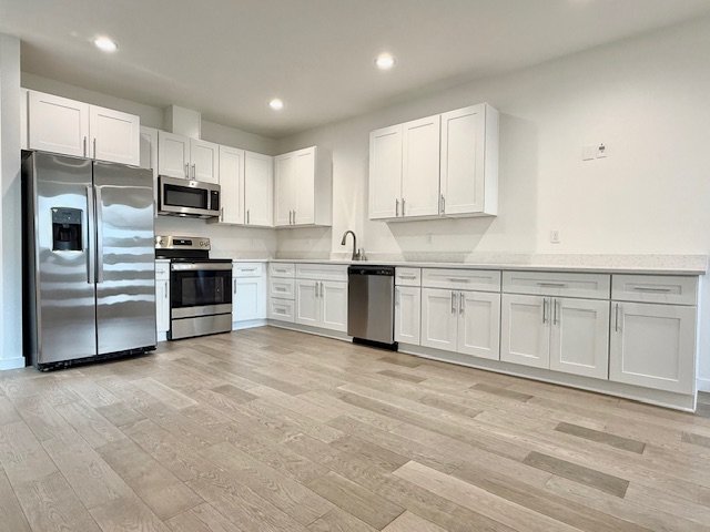 - Contemporary kitchen featuring stainless steel appliances, quartz countertops & generous cabinetry