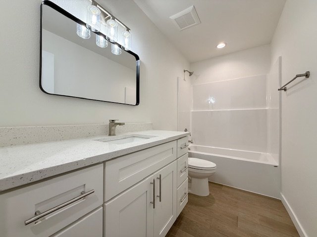 - 1 full bathroom with tub, quartz vanity, and linen closet