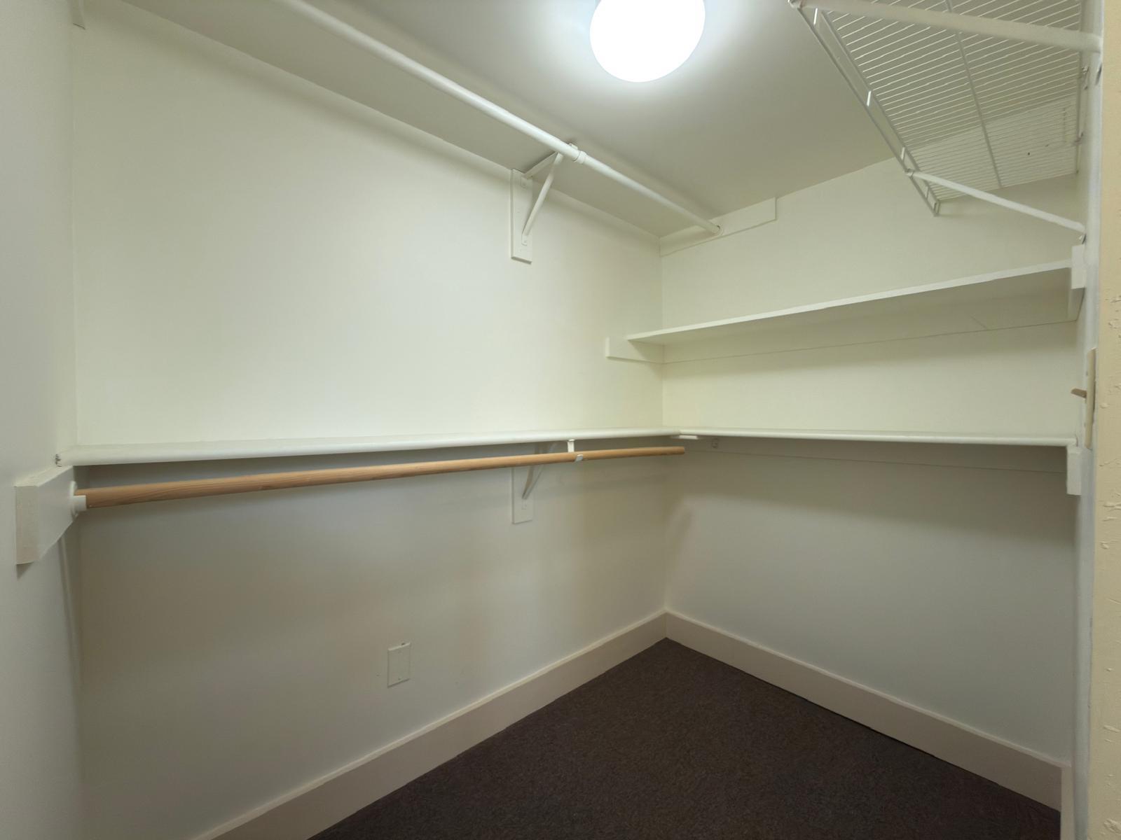 Primary Suite & Storage: Includes two full bathrooms and a large walk-in closet equipped with built-in shelving and hanging rods.